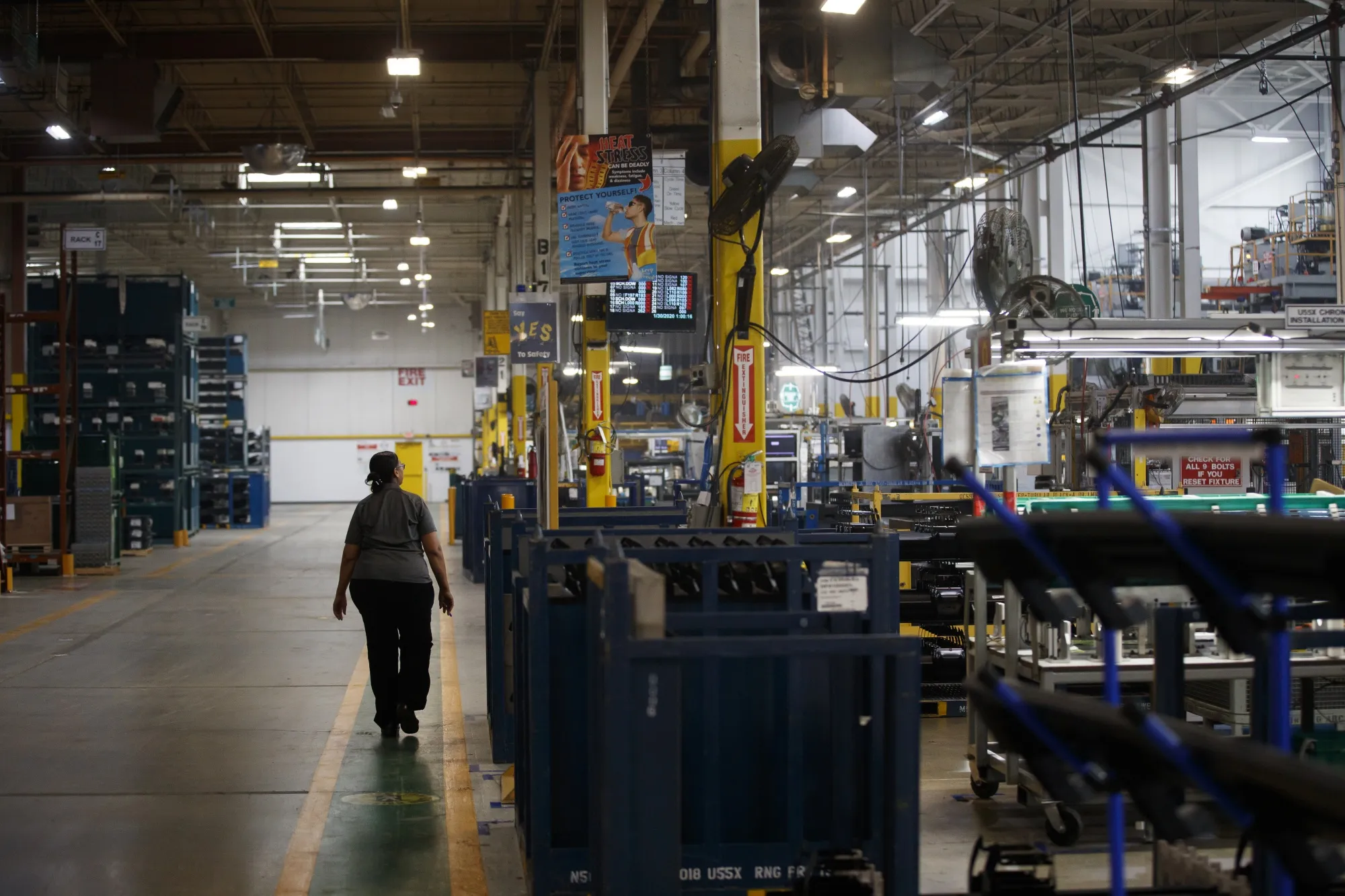 一名员工在安大略省布兰普顿的ABC科技公司设施旁走过。