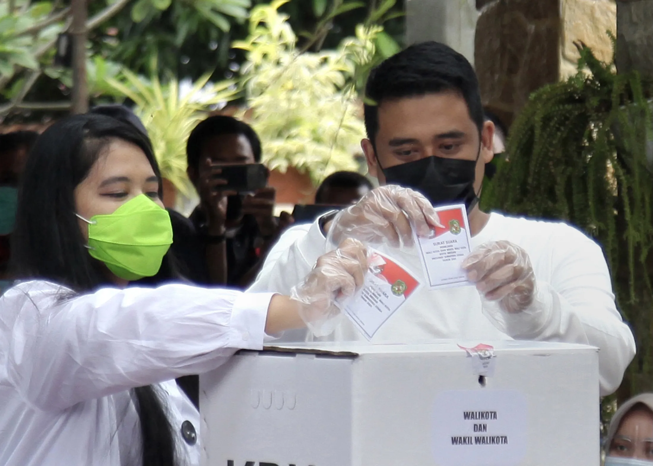 博比·纳苏提翁(右)和他的妻子卡希扬·阿尤在2020年在美丹投票。摄影师:阿尔伯特·伊万·达马尼克/法新社/盖蒂图片社虽然普拉博沃的候选人在雅加达的选举中落后,这场比赛可能仍会进入决选,但他的候选人在37个省的选举中将会获得权力,通常得益于佐科维多多的支持,他的明星效应依然强劲。在佐科上个月离任之前,他的支持率达到了75%,几乎是印度尼西亚总统完成第二任期时前所未有的高水平。