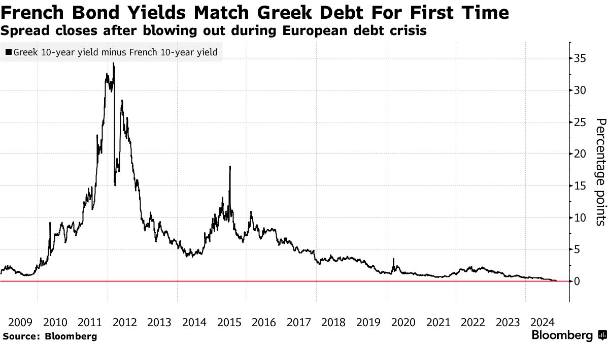 法国的基准债券收益率首次与希腊持平,这使得欧元区第二大经济体与曾经处于欧洲主权债务危机中心的国家处于同一水平。