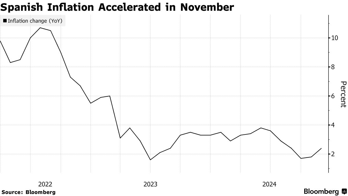 政策制定者将会忽视欧元区的这一上升,分析师预计周五11月份的数字将为2.3%。欧洲央行仍计划在两周内将存款利率第四次下调至3%。