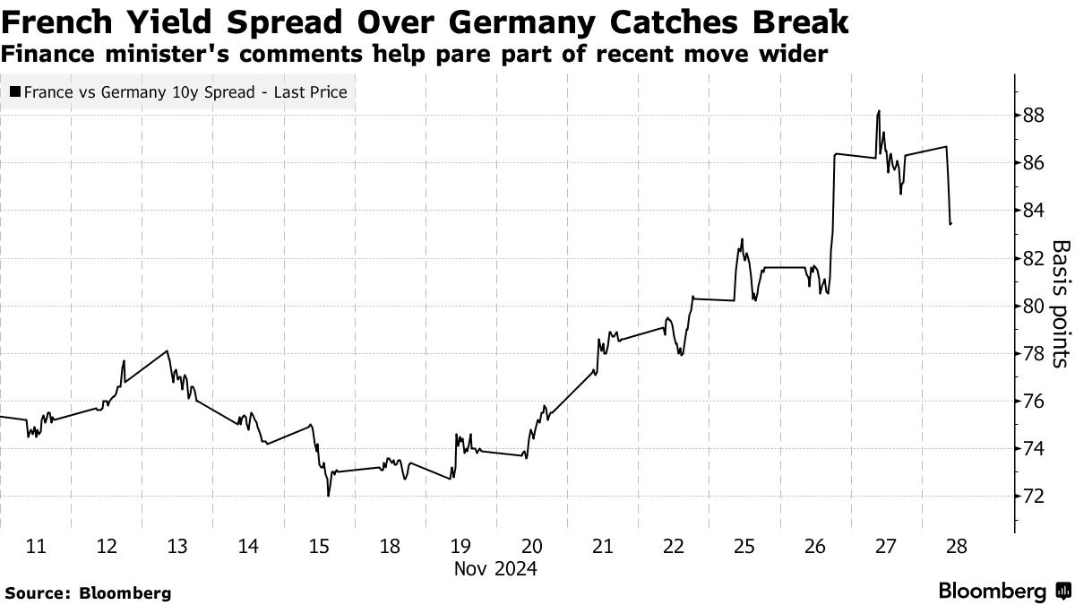 在阿尔芒的评论之后,法国债券收益率相对于德国缩小了三个基点,降至83。由于投资者预计议会投票否决预算的可能性增加,周三利差扩大至90个基点。