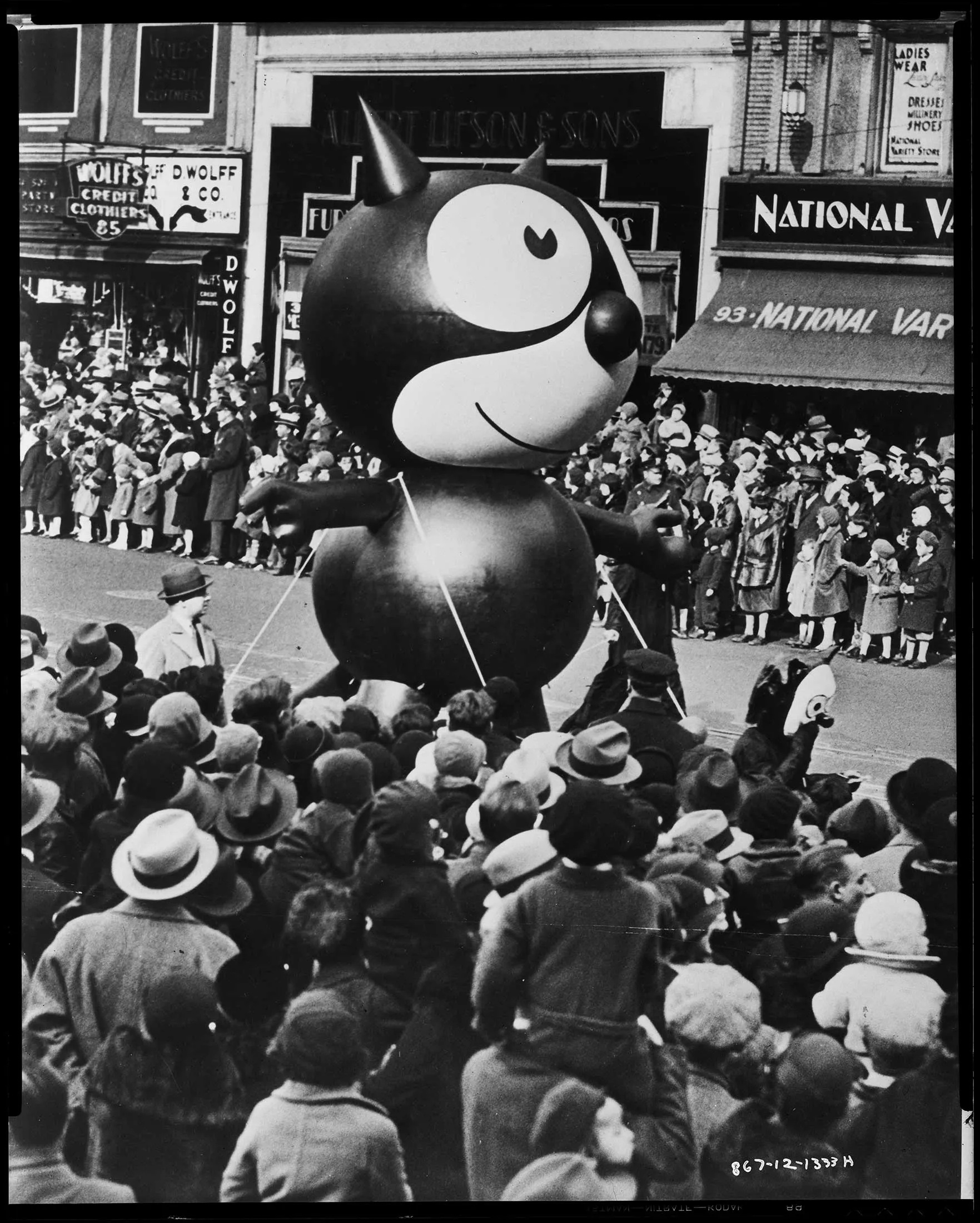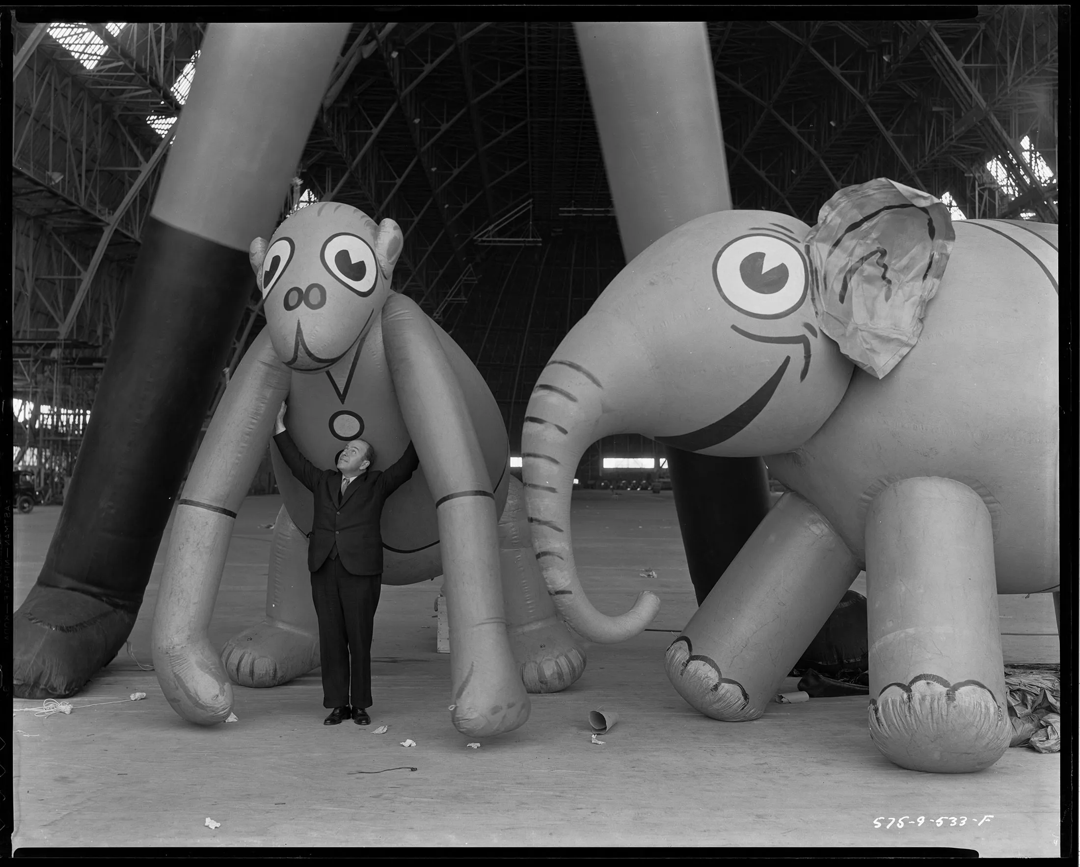 一个人,作为比例,和1933年梅西游行气球的一些。摄影师:固特异轮胎和橡胶公司记录/档案和特别收藏/大学图书馆/阿克伦大学多年来,游行经历了许多变化。在第二次世界大战期间,它被暂停,放气的气球为战争提供了橡胶和氦气。新角色总是被轮换进来(尽管史努比仍然保持着 历史上最多的气球记录)。