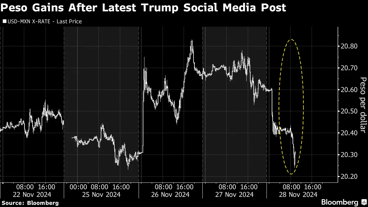 比索的波动是交易者可能会从当选总统的社交媒体帖子中预期的最新信号。本周初,比索跌至两年多以来的最低水平,此前特朗普承诺对中国、墨西哥和加拿大征收更多关税,这是他在11月5日选举胜利后首次针对全球贸易流动的具体威胁。