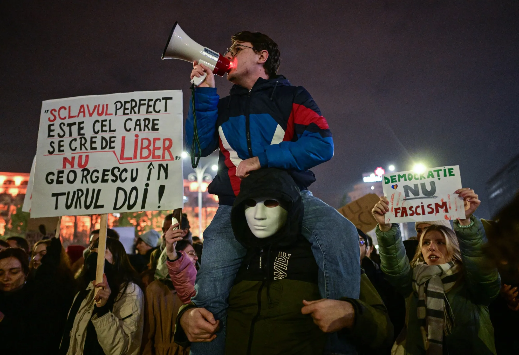 抗议者于11月27日在布加勒斯特的胜利广场抗议卡林·乔治斯库。摄影师:丹尼尔·米哈伊莱斯库/法新社/盖蒂图片社卡林·乔治斯库是一位边缘政治家,以独立身份参选,并在社交媒体平台TikTok上进行自我宣传,他在选举第一轮中意外获胜,成为罗马尼亚自35年前共产主义垮台以来政治最大变革之一。