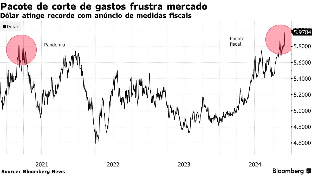 美元今晨达到5.9995雷亚尔,创下历史上最高的日内交易价,此前在周三已经创下收盘纪录,因市场认为该计划不足以稳定公共债务。在财政不确定性中,国内利率曲线开始定价货币紧缩周期结束时的基准利率为14.50%,并且有可能在12月上调1个百分点。
