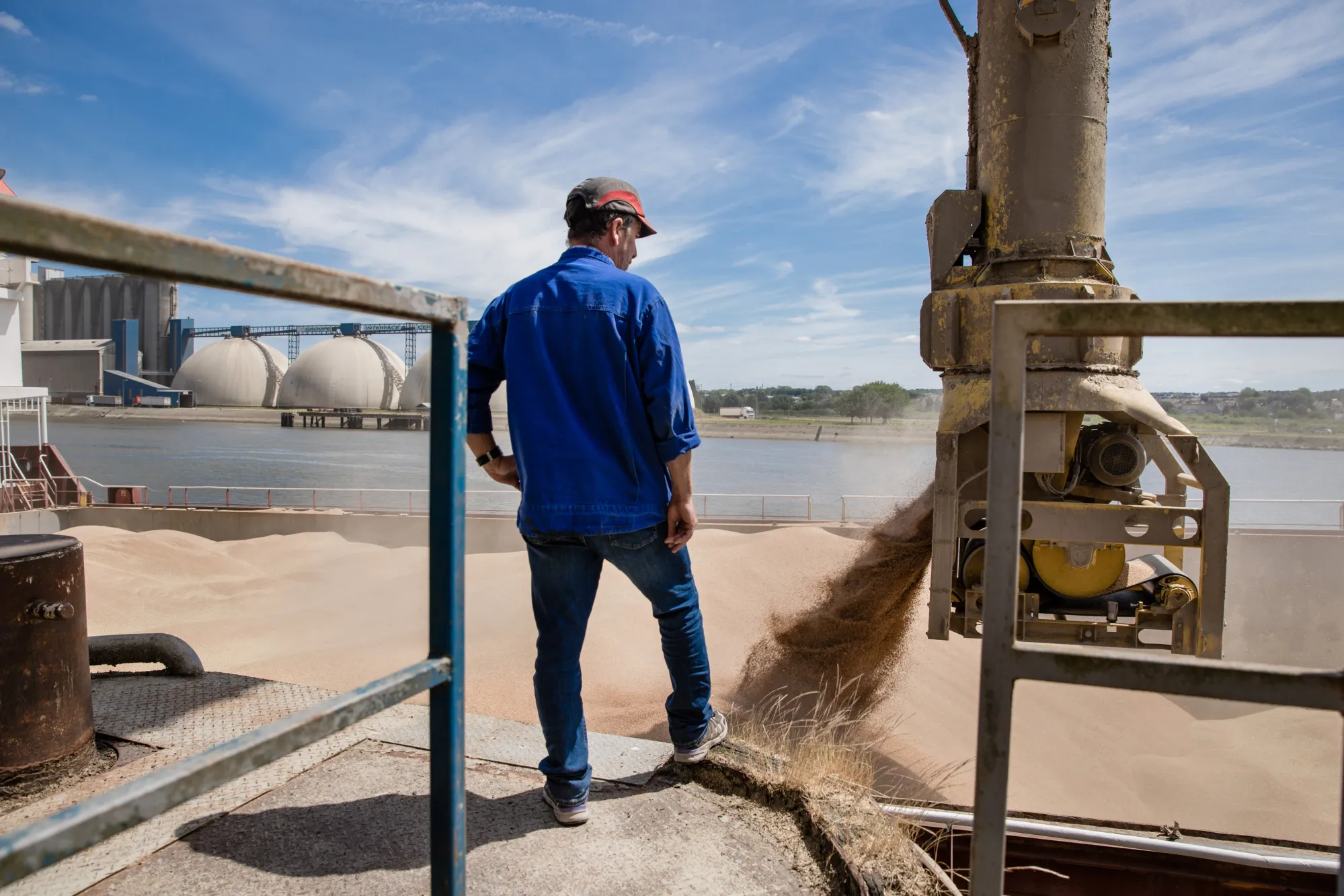 一名工人在法国拉昂港观看货船装载小麦。