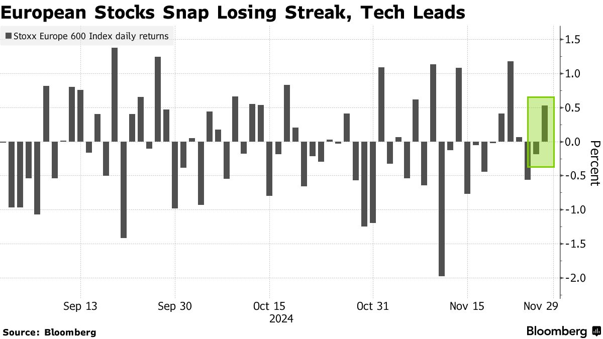 欧洲斯托克600指数在伦敦收盘时上涨0.5%,早些时候曾上涨至0.8%。与半导体相关的股票如ASML控股公司、VAT集团和Aixtron SE均上涨。美国期货也上涨,尽管现金市场因感恩节假期而关闭。