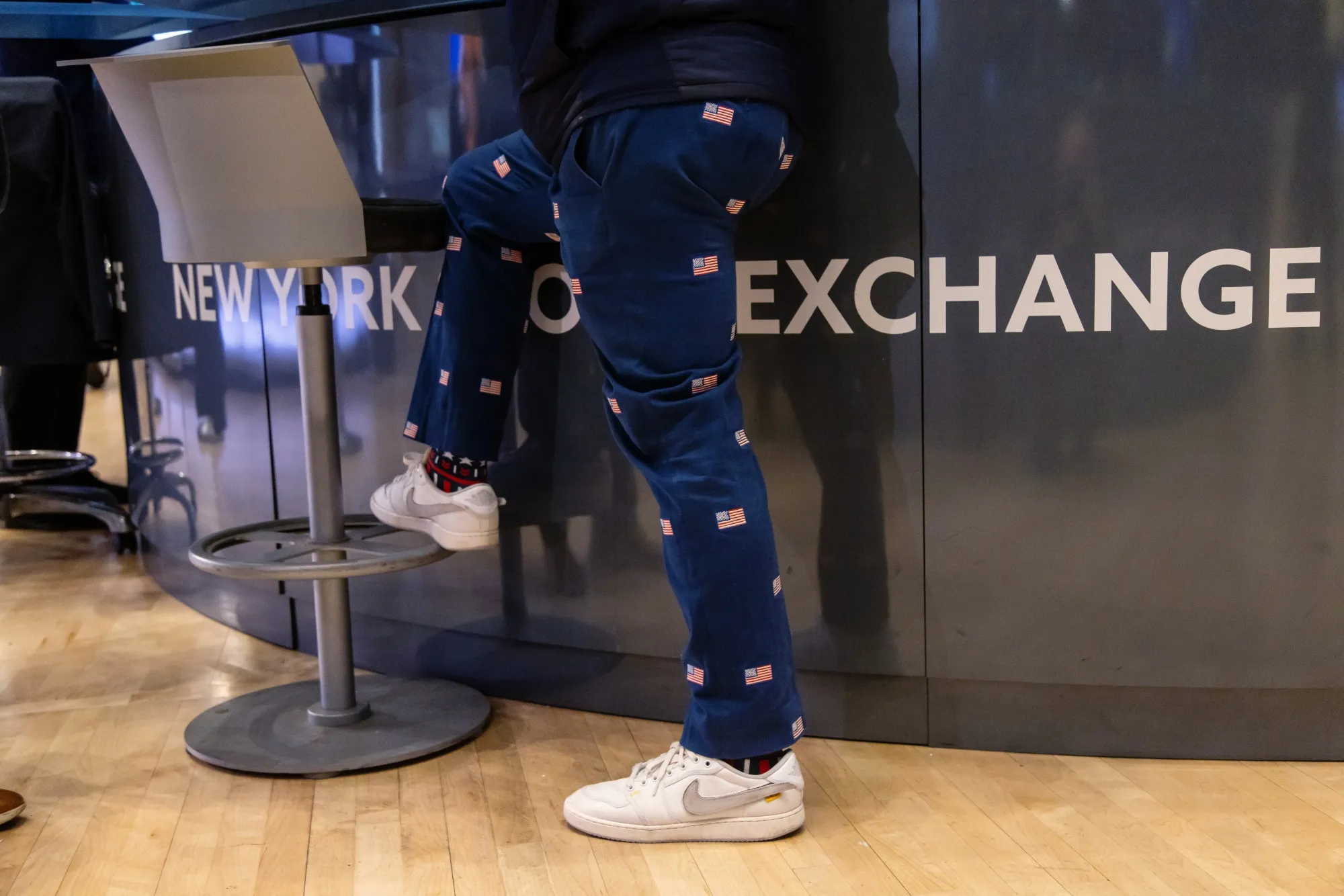 一位穿着美国国旗裤子的交易员在美国纽约证券交易所(NYSE)的交易大厅工作,时间是2024年11月6日,星期三。