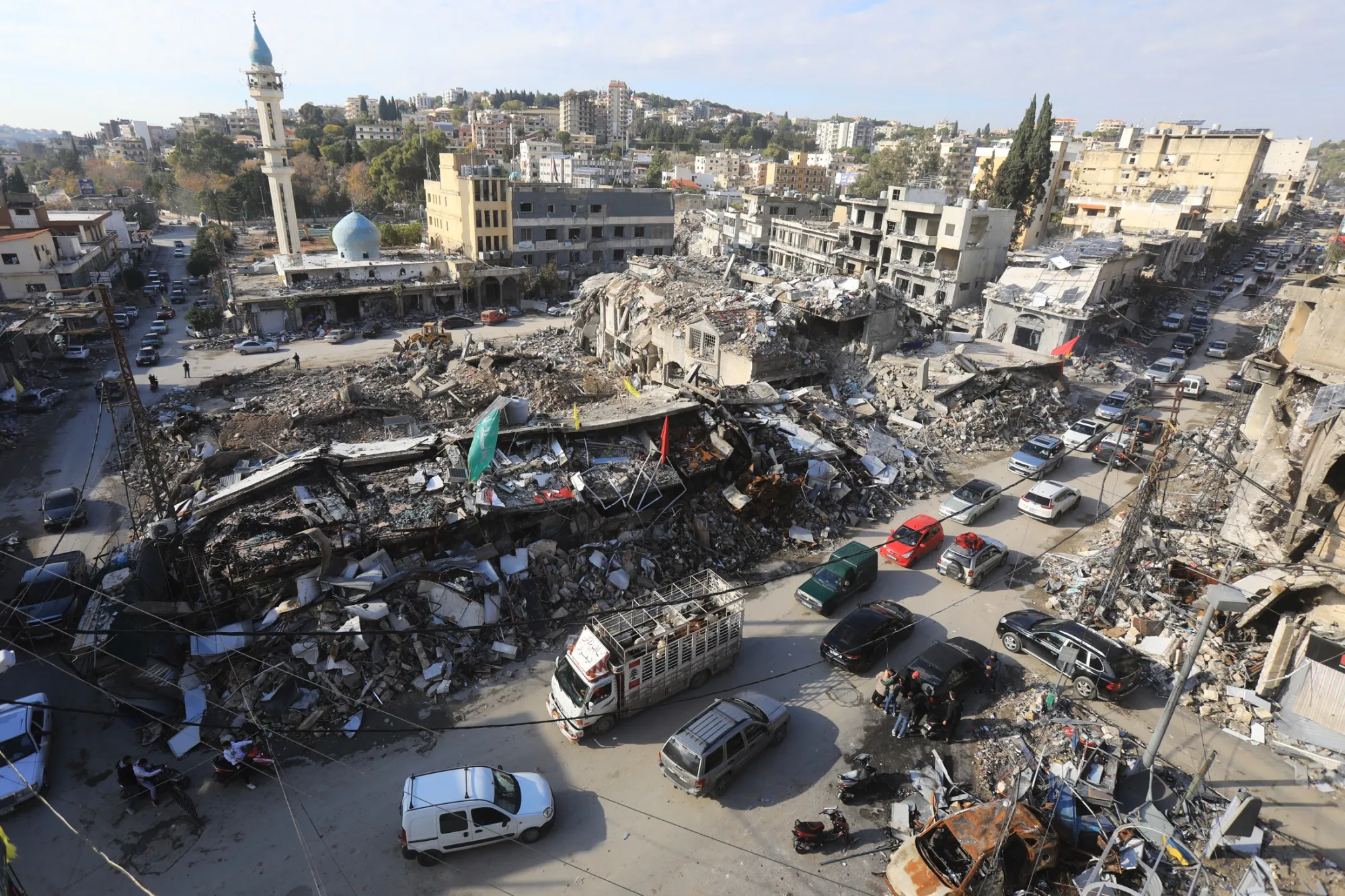 11月28日,黎巴嫩纳巴提耶的交通经过被毁的建筑。