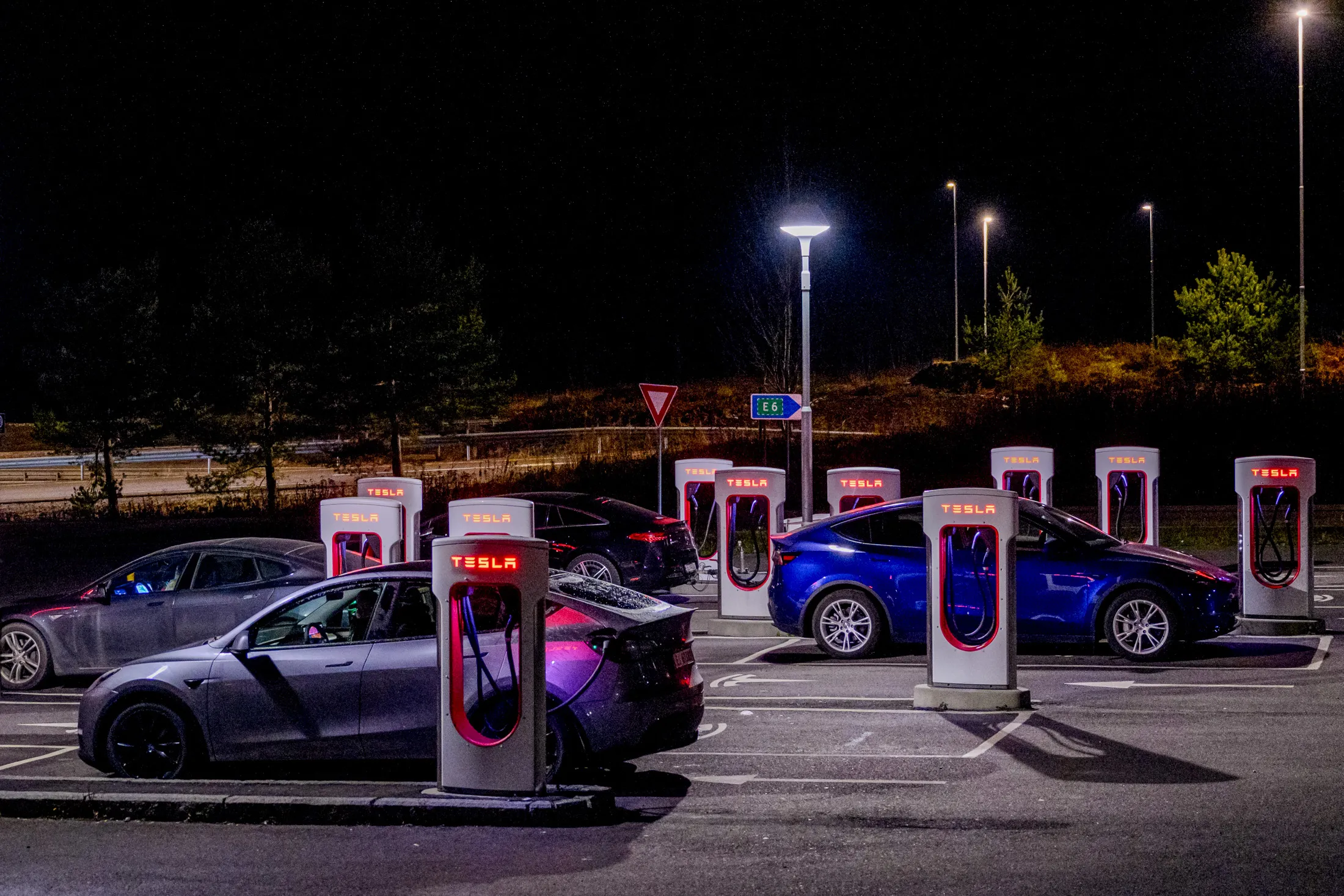 特斯拉充电站位于奥斯陆附近的充电中心。### 更多来自彭博社的内容
