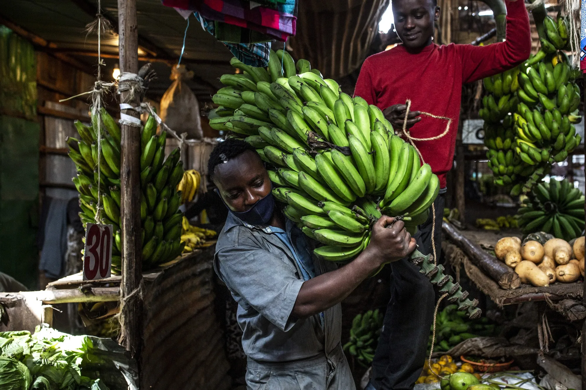 一位商贩在肯尼亚内罗毕的托伊市场摊位上出售香蕉。