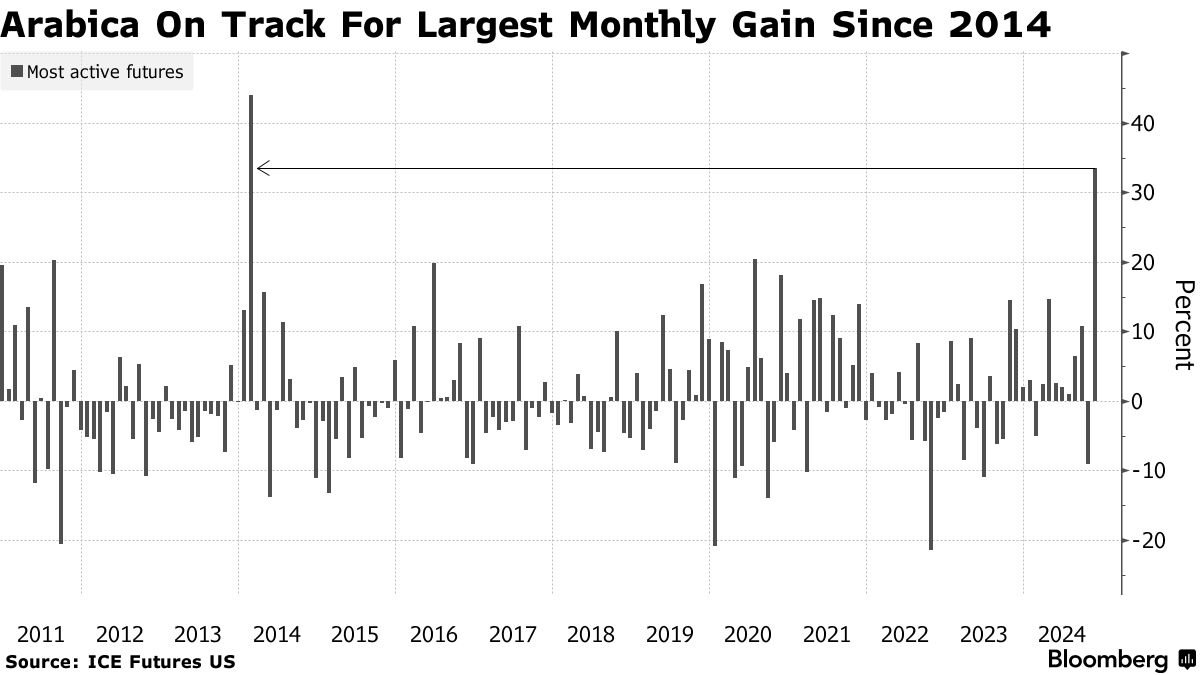 阿拉比卡咖啡因供应担忧而准备迎来自2014年以来最大的月度涨幅 - 彭博社