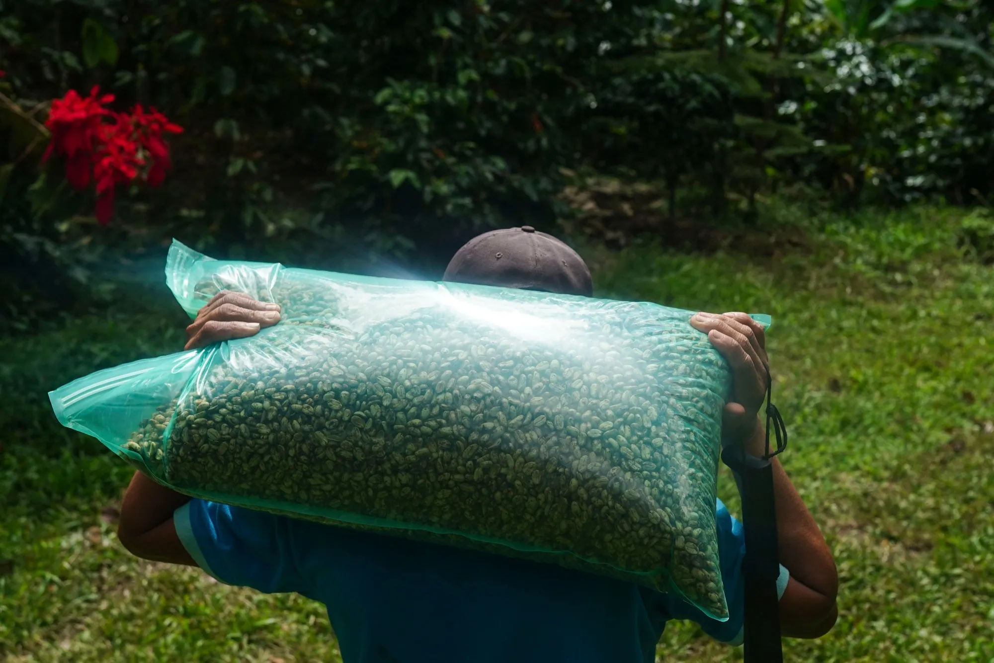 一名工人在萨尔瓦多的拉利伯塔德省特佩科约的农场上搬运包装好的阿拉比卡咖啡樱桃。