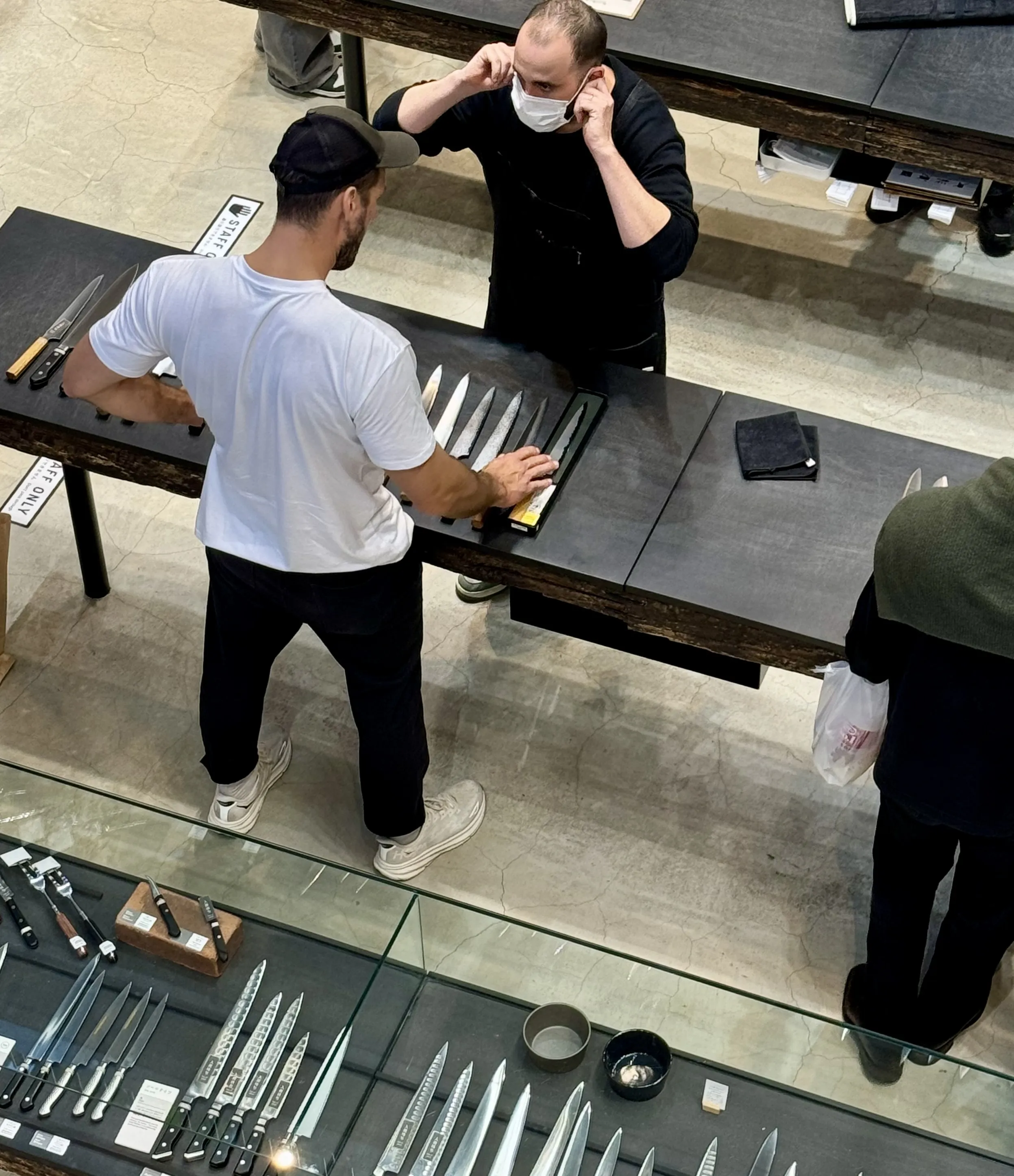 他还在寻找作为礼物送给他餐厅厨师的刀具。当我离开他时,他正坐在成立于1908年的Kama-Asa Shoten的柜台前。合羽桥店的桌面可以用作切菜板。