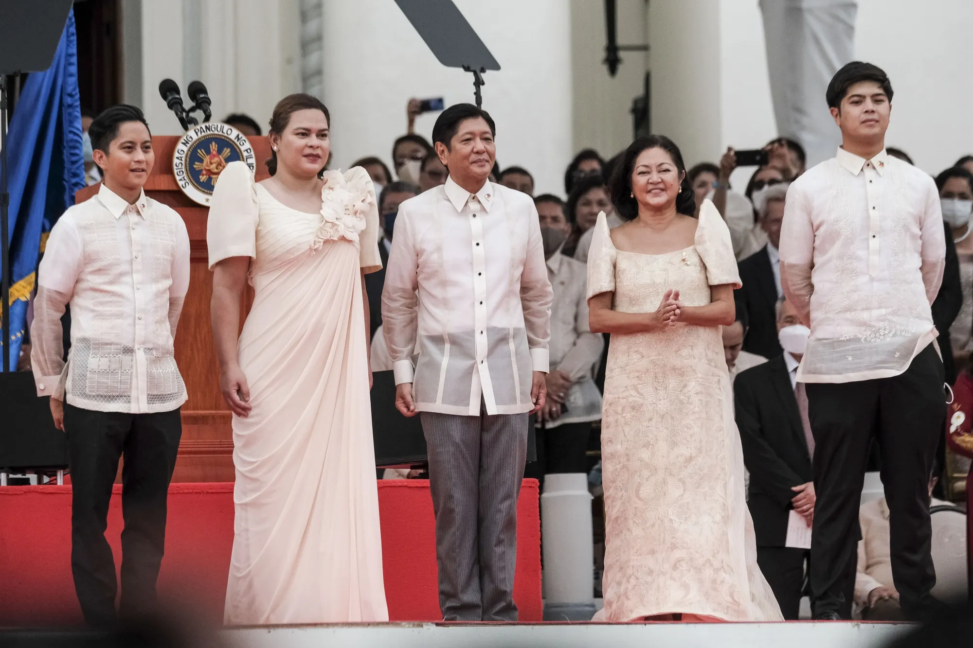 在更快乐的时光:菲律宾总统费迪南德“邦邦”马科斯 Jr.(中),与副总统萨拉·杜特尔(左二)在2022年6月30日的宣誓仪式上。