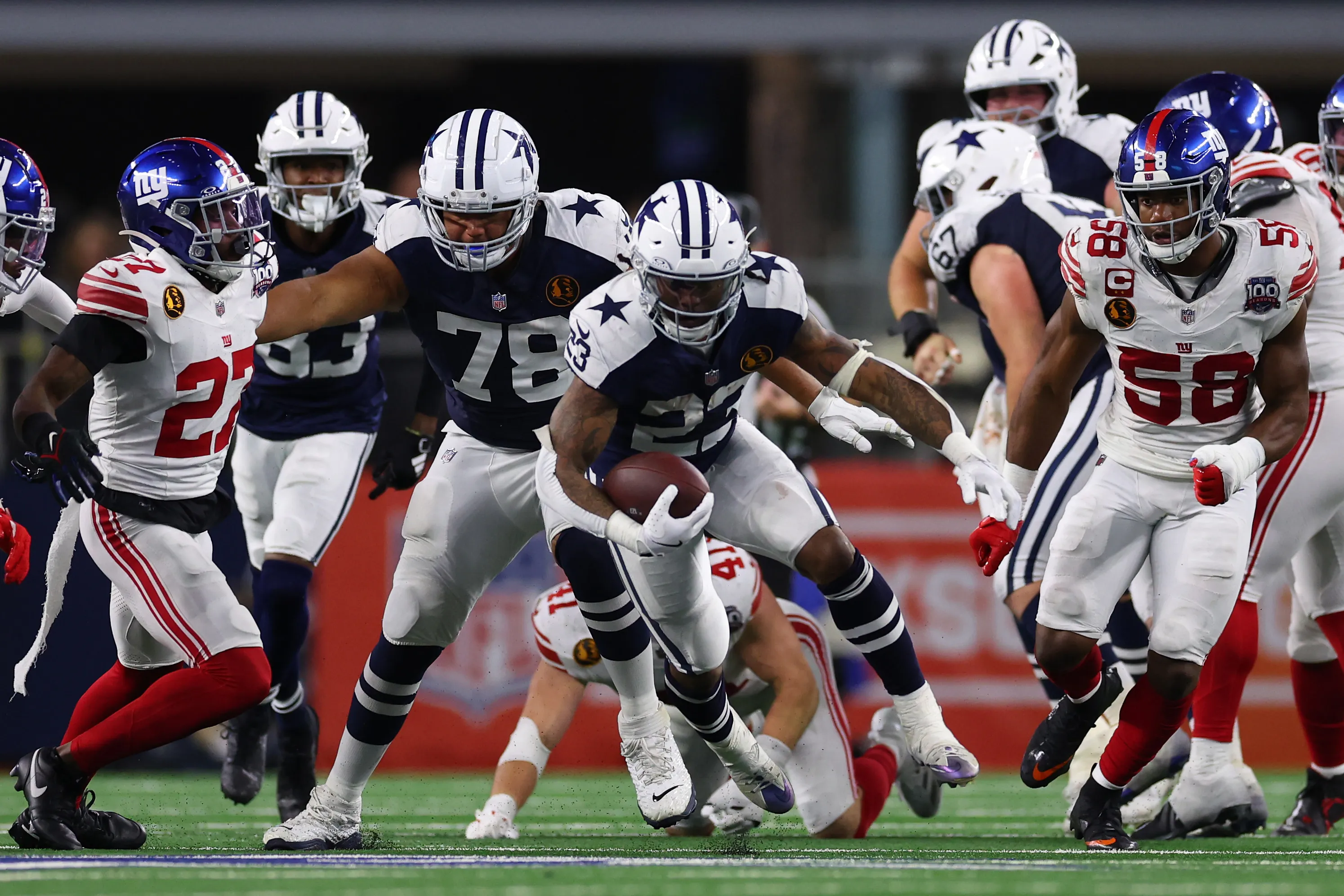 达拉斯牛仔队的里科·道德尔(Rico Dowdle)在德克萨斯州阿灵顿与纽约巨人队的比赛中,在第四节持球跑动,时间是11月28日。