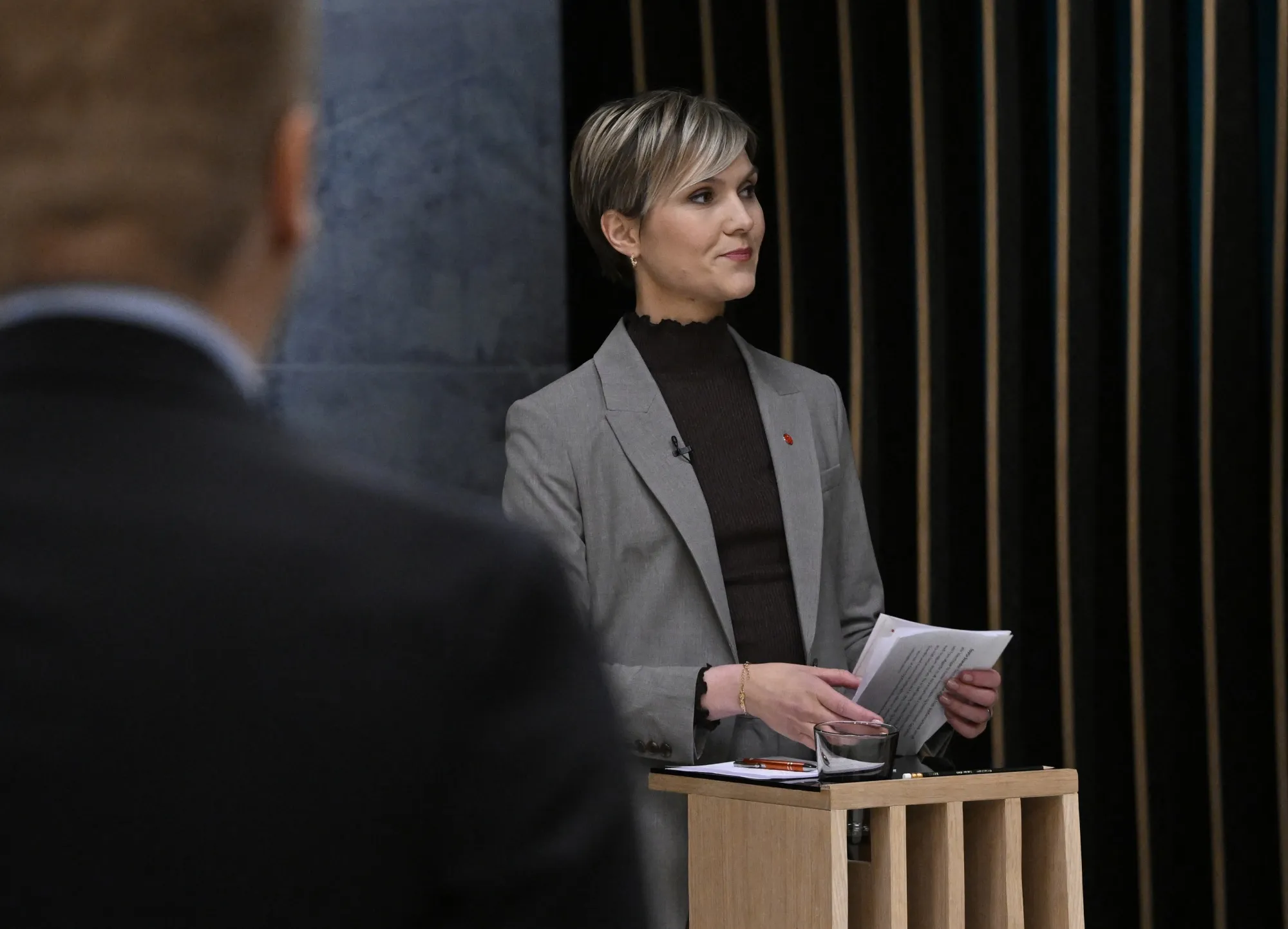克里斯特伦·弗罗斯塔多蒂尔在11月29日雷克雅未克的选举前电视辩论中。摄影师:哈尔多尔·科尔贝因斯/法新社/盖蒂图片社(彭博社) — 冰岛人在周六的快闪议会选举中走向投票站,这次选举有望因对高生活成本的不满而重新绘制政治格局,即使在经济降温的情况下。