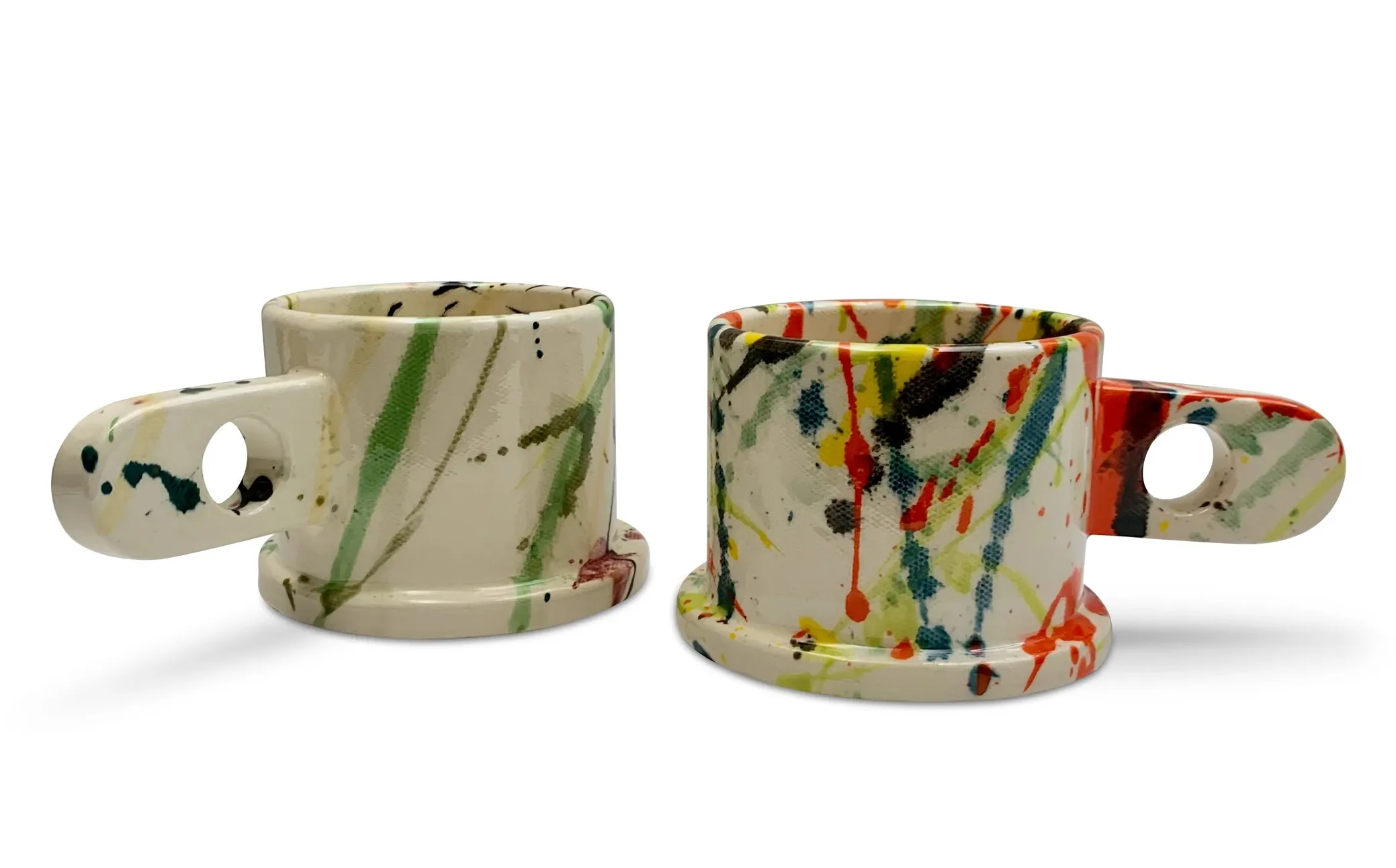 来源:Lacma彼得·希尔手工喷溅陶瓷杯。 这是艺术顾问莫莉·爱泼斯坦推荐的。这些独特的杯子由孟菲斯集团艺术家希尔设计,并由他在洛杉矶回声公园社区的居民手工绘制。$90