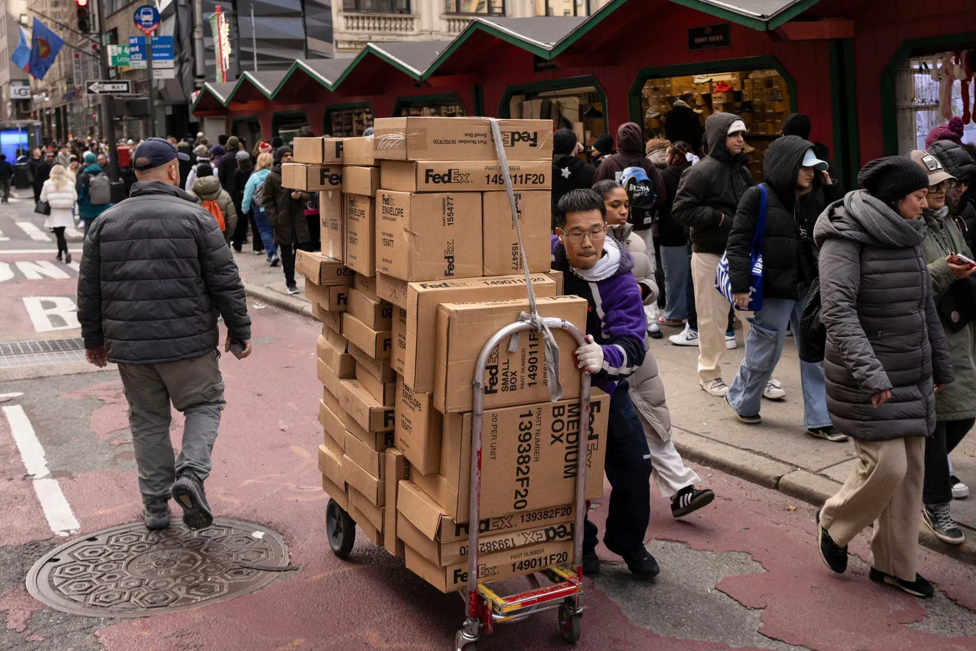 一名联邦快递送货员在11月29日的黑色星期五在纽约搬运包裹。摄影师:岩村幸/Bloomberg商家正在全力以赴推出促销活动,以吸引消费者并应对今年较短的购物季。沃尔玛公司延长了黑色星期五的促销,并提供更多折扣。这家全球最大的零售商表示,苹果AirPods、65英寸Roku电视和男士牛仔裤是黑色星期五店内的畅销商品。由于11月气温高于平均水平,购物者还购买了睡衣套装和连帽衫等冬季服装。