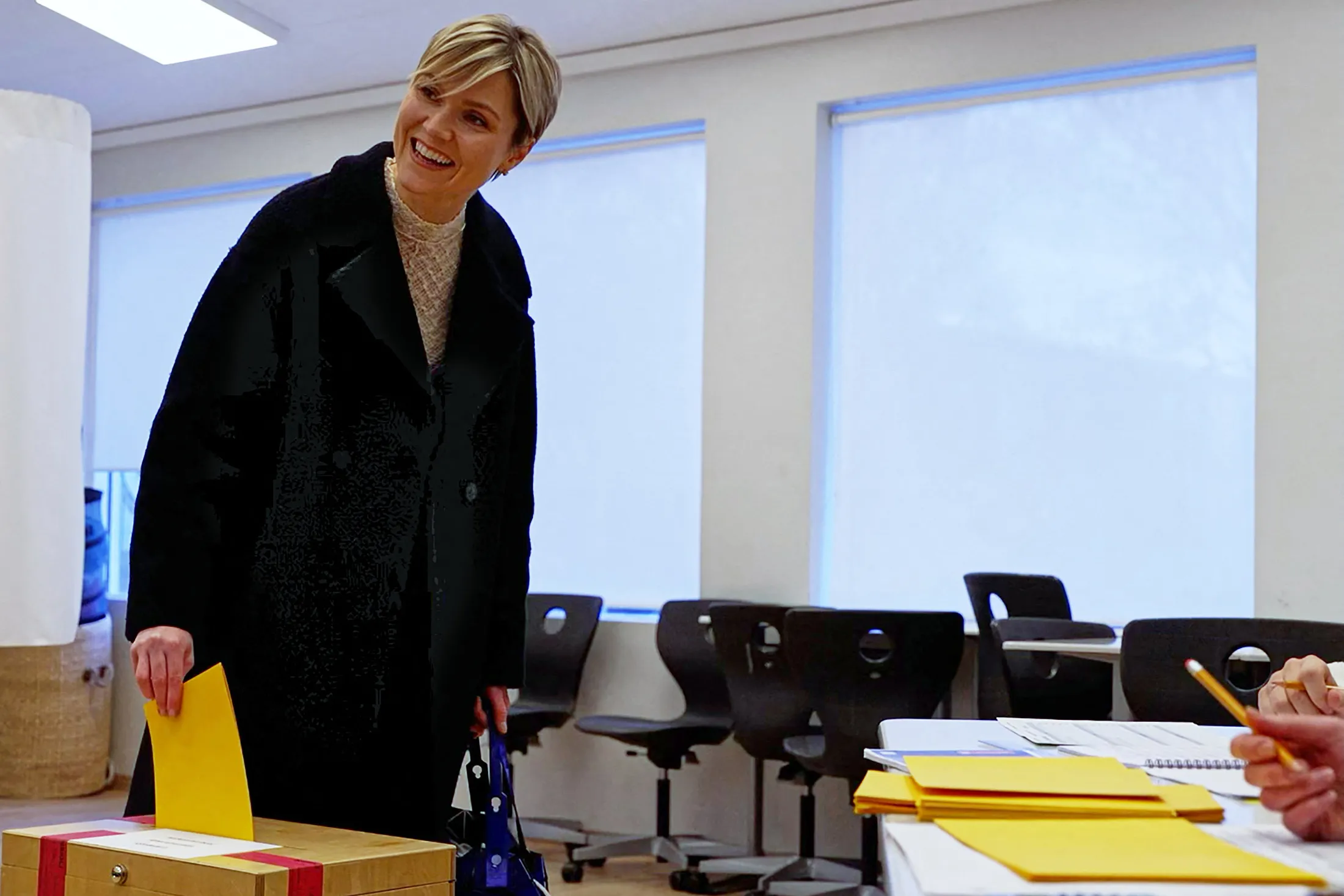 克里斯特伦·弗罗斯塔多蒂尔在雷克雅未克的投票站投票,参加11月30日的议会选举。