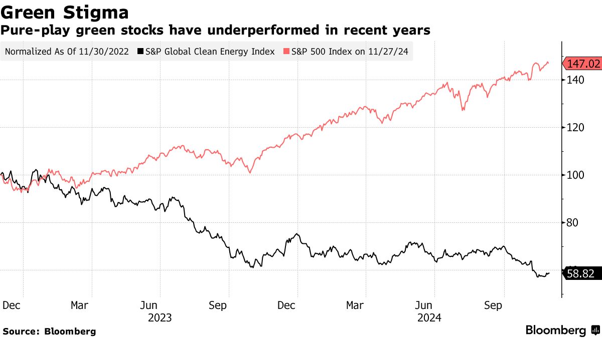 这是一个在气候金融日益紧张的背景下进行的对话。近年来,纯绿色投资如太阳能和风能在很大程度上被证明是一个失败的赌注, S&P全球清洁能源指数自2023年初以来下跌了近40%。在同一时期, S&P 500指数上涨了超过50%。