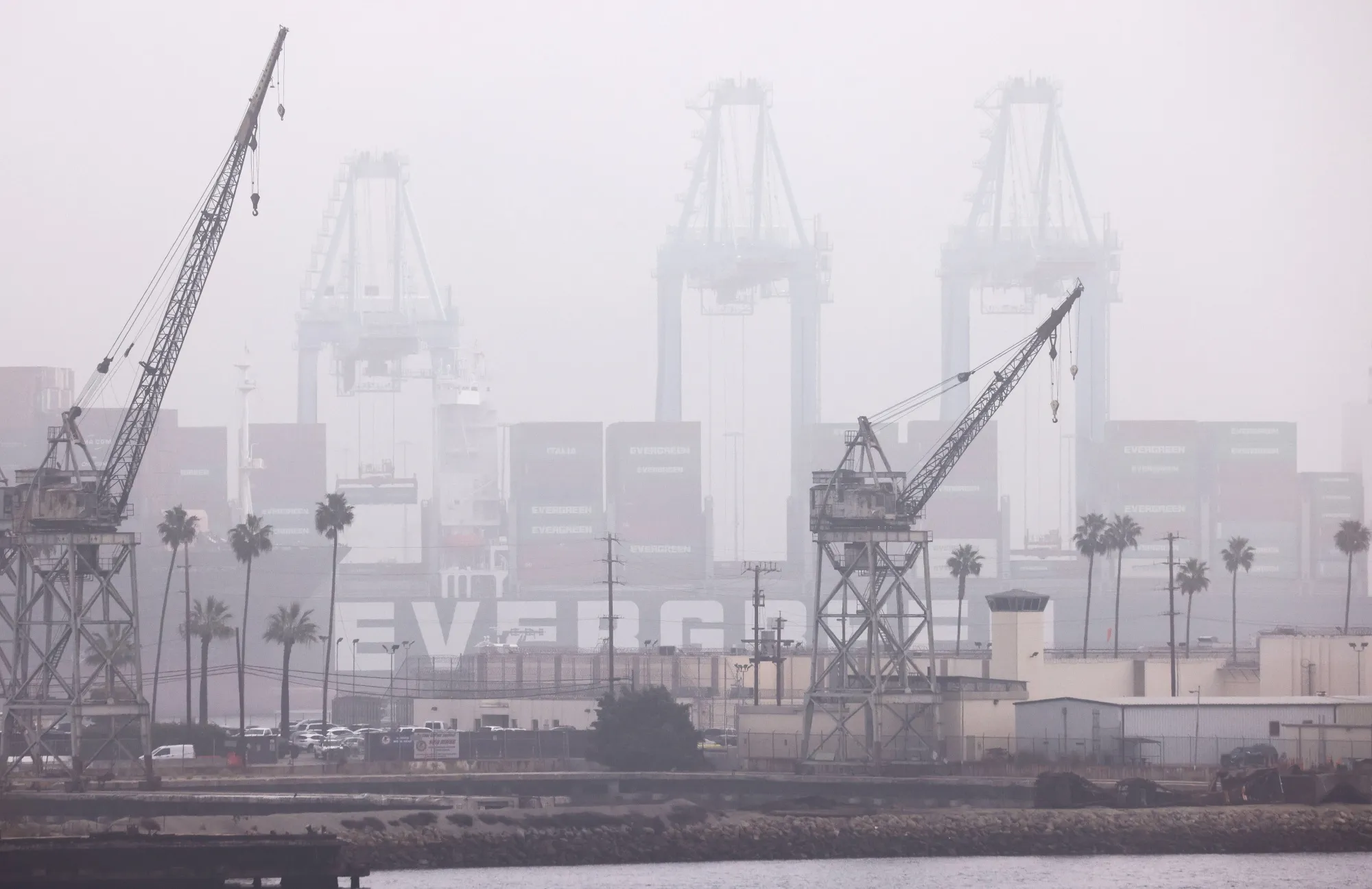 在洛杉矶港的圣佩德罗,一艘集装箱船上的集装箱在雾中可见。