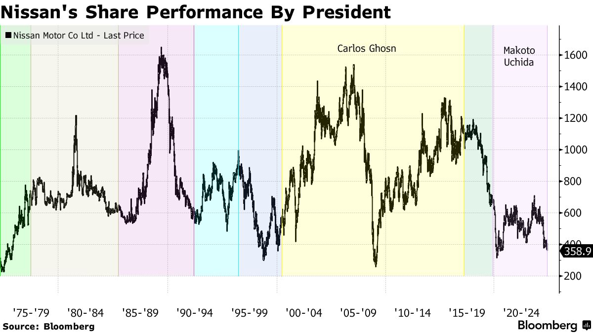 在内田的领导下,日产的股票表现落后于MSCI全球汽车指数超过170点——自1999年全球基准推出以来,任何首席执行官的相对表现最差。