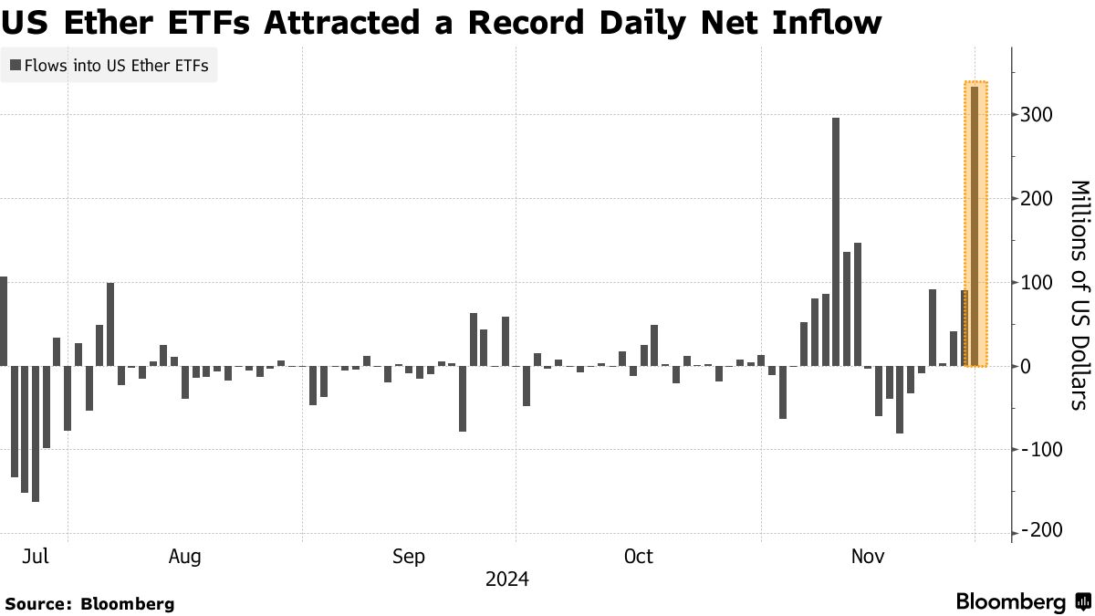 美国交易所交易基金直接投资于比特币和以太坊的需求前所未有,受到当选总统唐纳德·特朗普承诺解除加密行业监管束缚的推动。