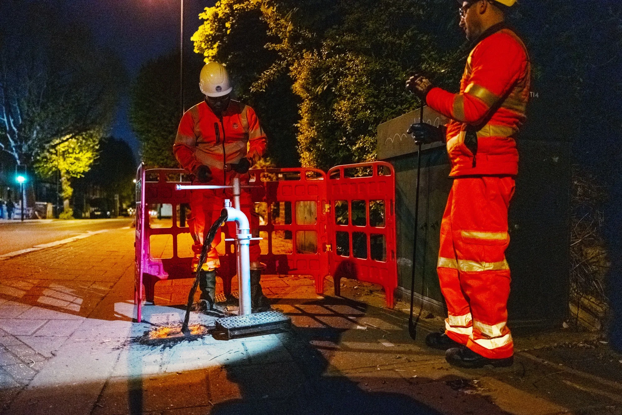 来自泰晤士水务的工程师在伦敦的夜班期间安装设备。