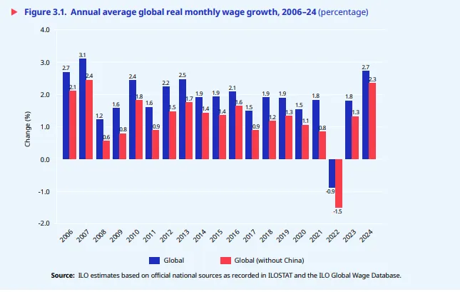 国际劳工组织在其报告中表示,中国的实际工资增长速度远快于其他新兴G-20经济体。而2024年的数据在该国没有放缓的迹象。若不考虑中国,全球工资增长今年将为2.3%。