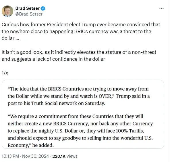 特朗普在周末重新回到社交媒体,警告所谓的金砖国家,他将 要求承诺 他们不会创造一种新的货币作为使用美元的替代品,并重申如果他们这样做将征收100%的关税。