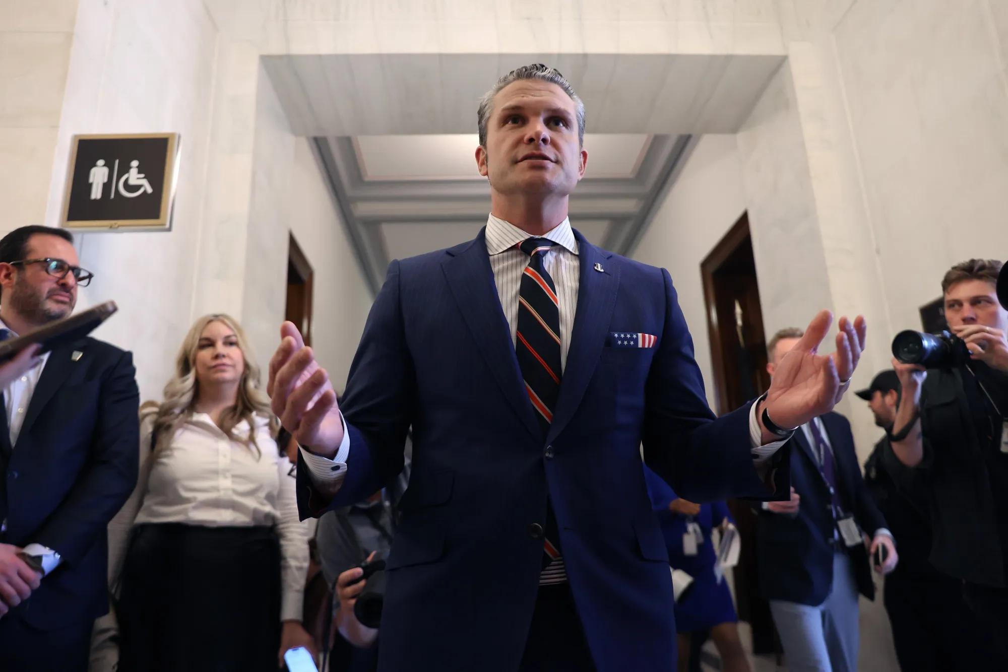 皮特·赫格塞斯在华盛顿特区国会山与参议员进行一系列会议后暂停与记者交谈,时间是11月21日。