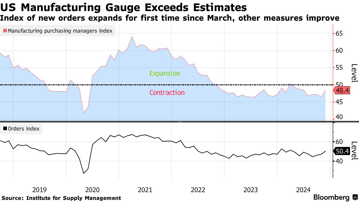 供应管理协会的工厂指标上升了1.9点,为3月份以来最大,达到48.4,周一公布的数据表明。彭博社对经济学家的调查中,媒体预测指数为47.5。尽管最新数据标志着连续第八个月收缩,读数低于50,但大多数影响整体指数的类别显示出改善。
