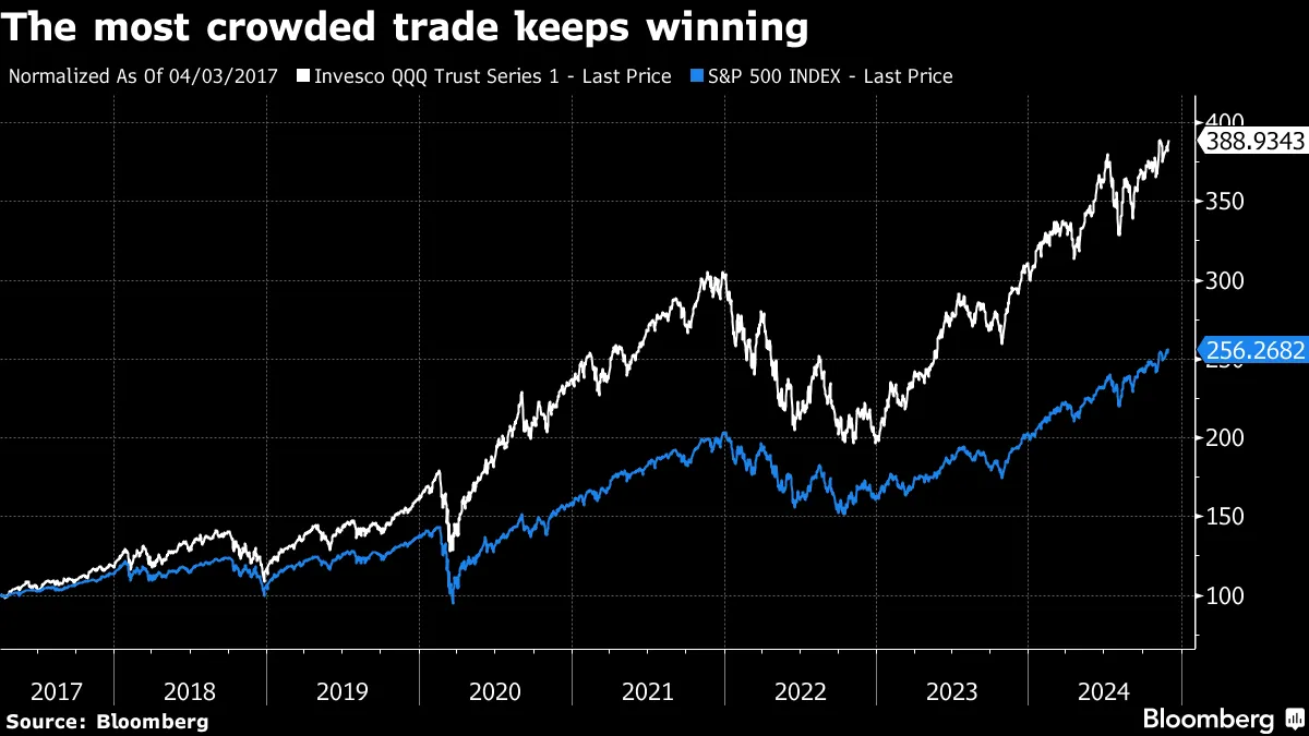美国银行与此同时,这里是自2017年4月以来QQQ ETF(跟踪纳斯达克100指数)与标准普尔500指数的图表。大型科技股在这段时间内一直压倒整体市场。换句话说,要在这一时期获胜,你必须参与大家所认为的“最拥挤的交易”。