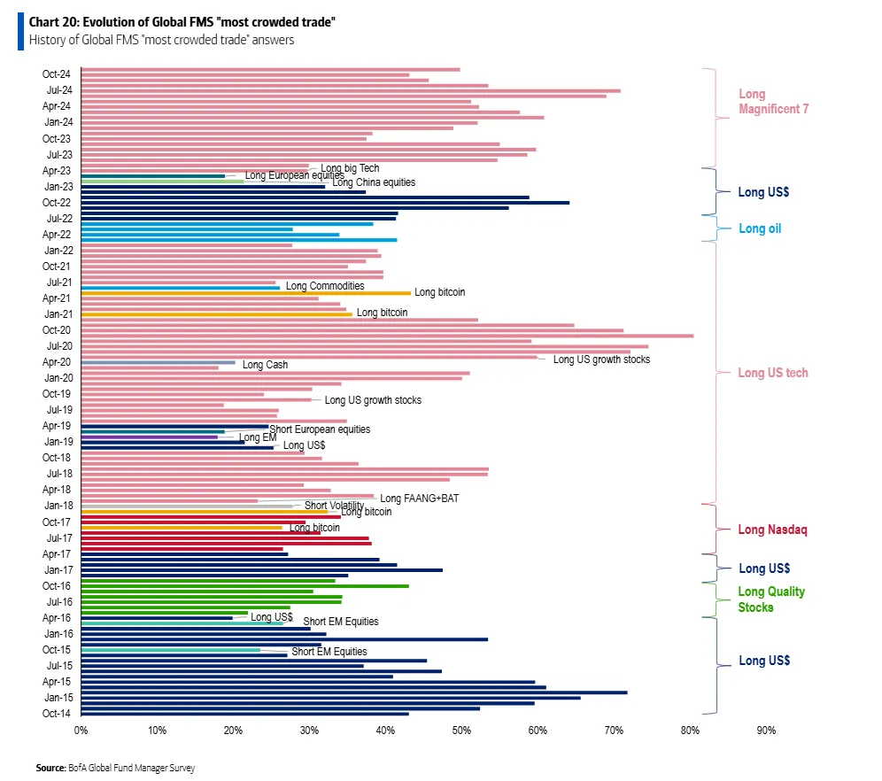 每个月,美国银行都会对基金经理客户进行调查。他们总是问的一个问题是,他们认为现在“最拥挤”的交易是什么。而令人惊讶的是,自2017年春季以来,只有少数例外,客户总是将某种形式的“看多大型科技股”视为最拥挤的交易: