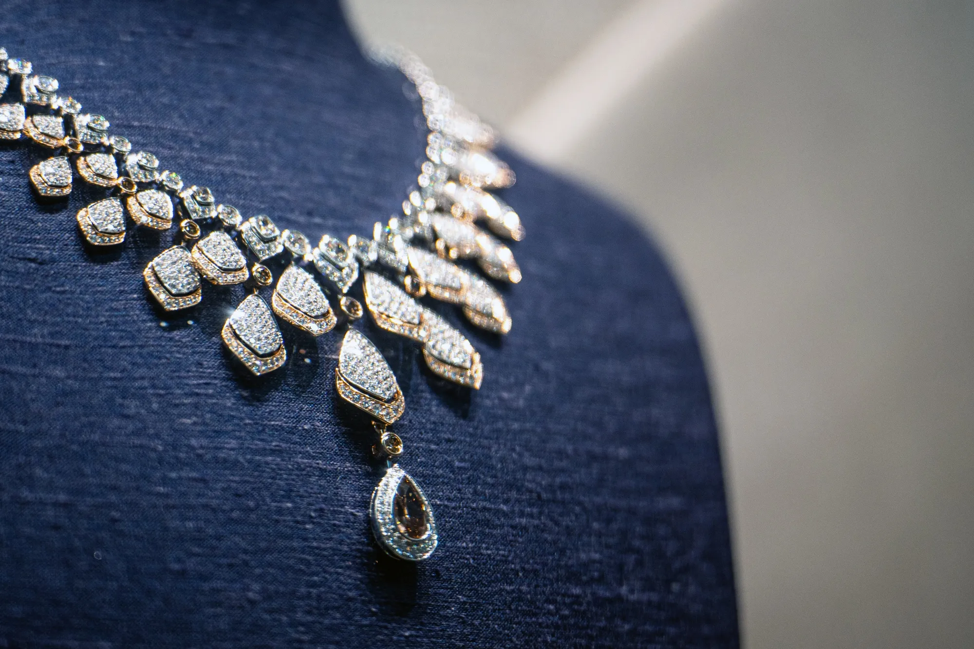 在香港德比尔珠宝店橱窗中展示的钻石项链。摄影师:林奕/彭博社