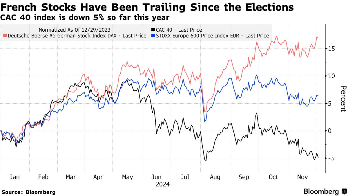 投资者几个月来一直对法国的政治困难感到担忧,正如政府一直试图推动减少其庞大赤字的措施一样。巴尔尼尔政府最初提出的预算法案包含600亿欧元(630亿美元)的增税和削减开支,旨在将赤字从预计的今年6.1%大幅调整至2025年的5%经济产出。