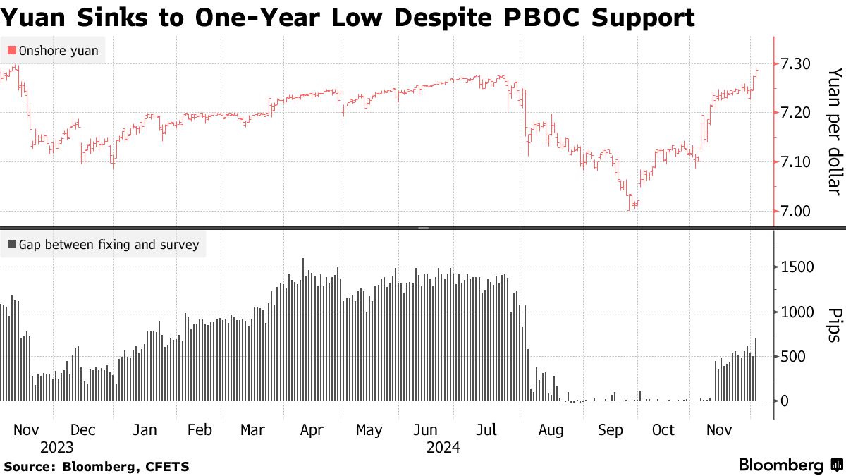 分析师预计人民币将在2025年突破17年来的低点,最悲观的观察者预测将下降约10%。货币交易员也在评估本月美联储可能降息的可能性,因为美国就业在11月可能大幅增长。