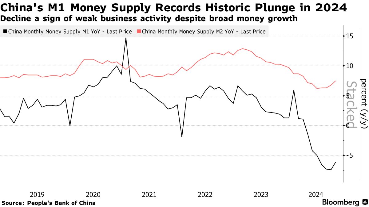 过去被视为商业活动和活力的指标,M1增长自去年以来显著放缓,并在今年年初开始收缩,即使广义货币供应M2仍在继续扩张。