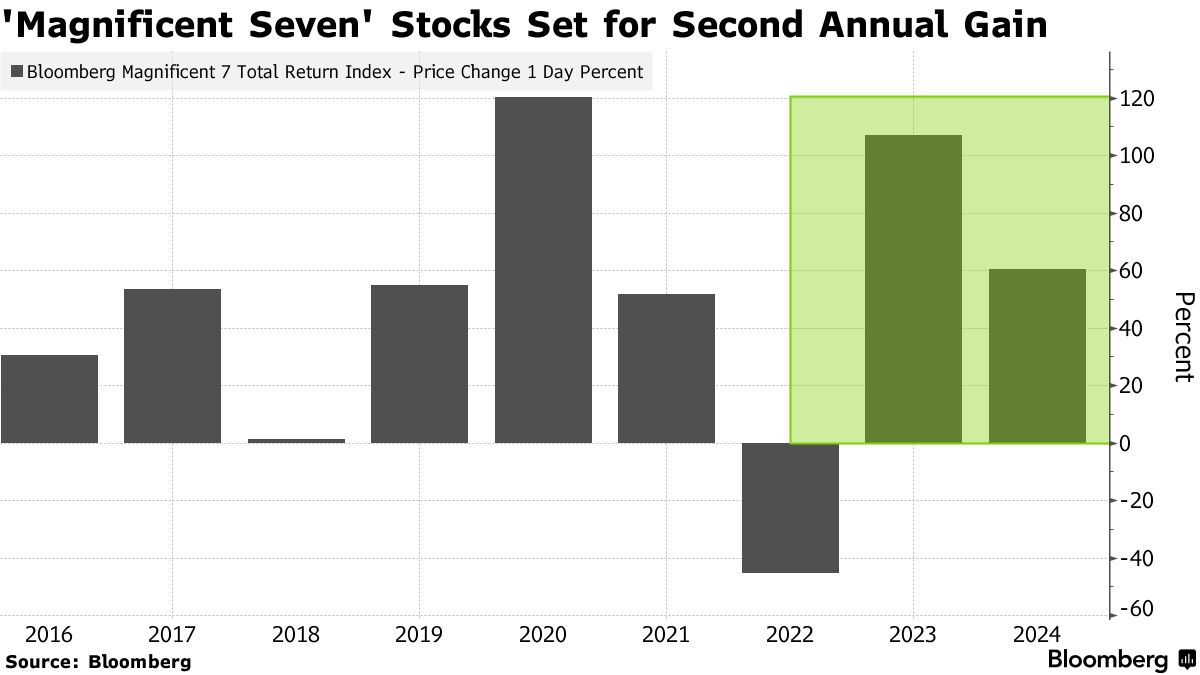 这些股票——特斯拉公司、Meta平台公司、微软公司、谷歌母公司Alphabet、亚马逊公司、苹果公司和英伟达公司——是全球最大的公司之一,主导了科技和人工智能的繁荣,并在多年内为美国股指的增长贡献了超出比例的份额。彭博社对这七只股票的指数今年迄今已上涨60%,在2023年翻了一番。