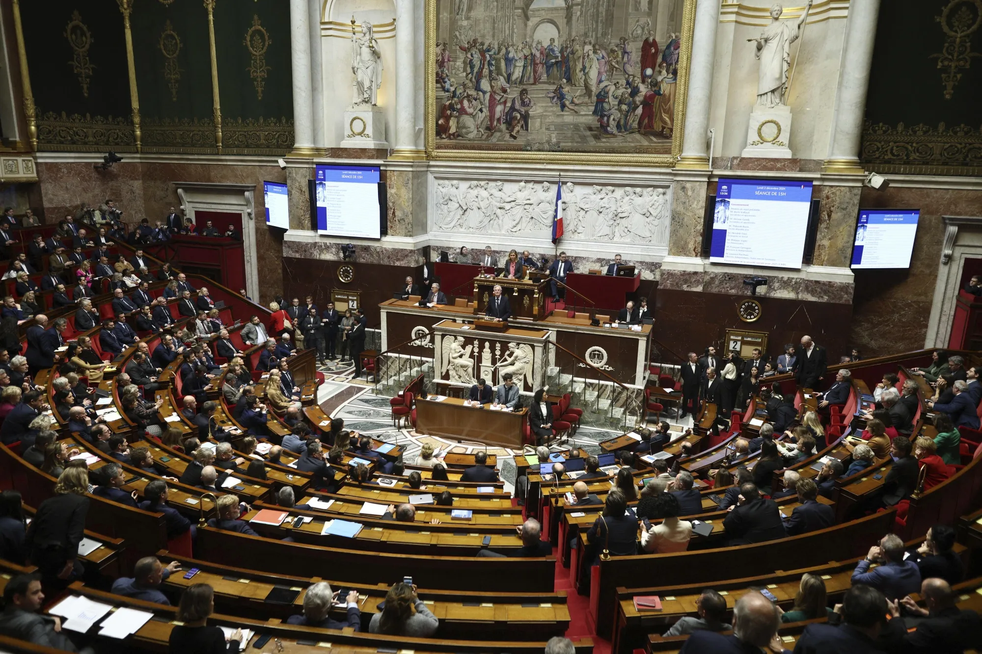 米歇尔·巴尔尼耶于12月2日在巴黎国民议会发表讲话。摄影师:拉斐尔·拉法尔格/SIPA/AP照片法国立法者将在周三举行不信任投票,极右派领导人玛丽娜·勒庞预计将与左翼联盟联手推翻政府。
