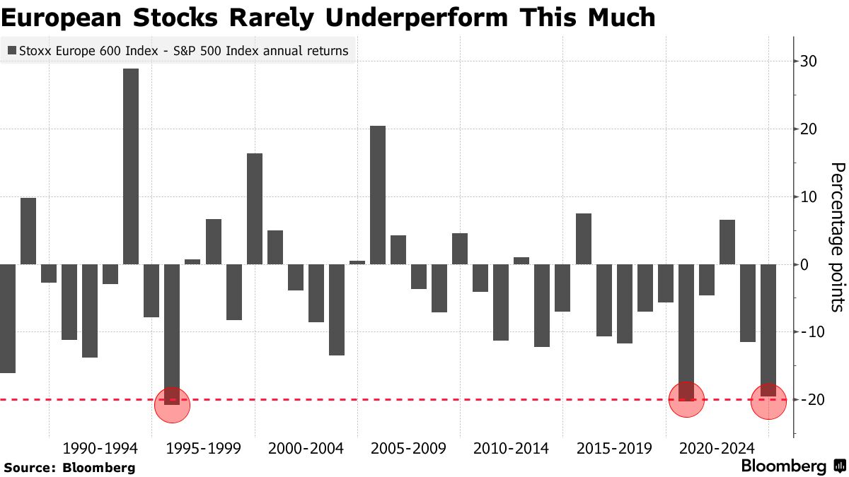 做空者正在放弃,因为标准普尔500指数不断创下新高,并有望迎来自2021年以来的最佳年份,而对欧洲股票的布局仍然看跌,进一步扩大了两者市场之间的差距,花旗集团的策略师表示。