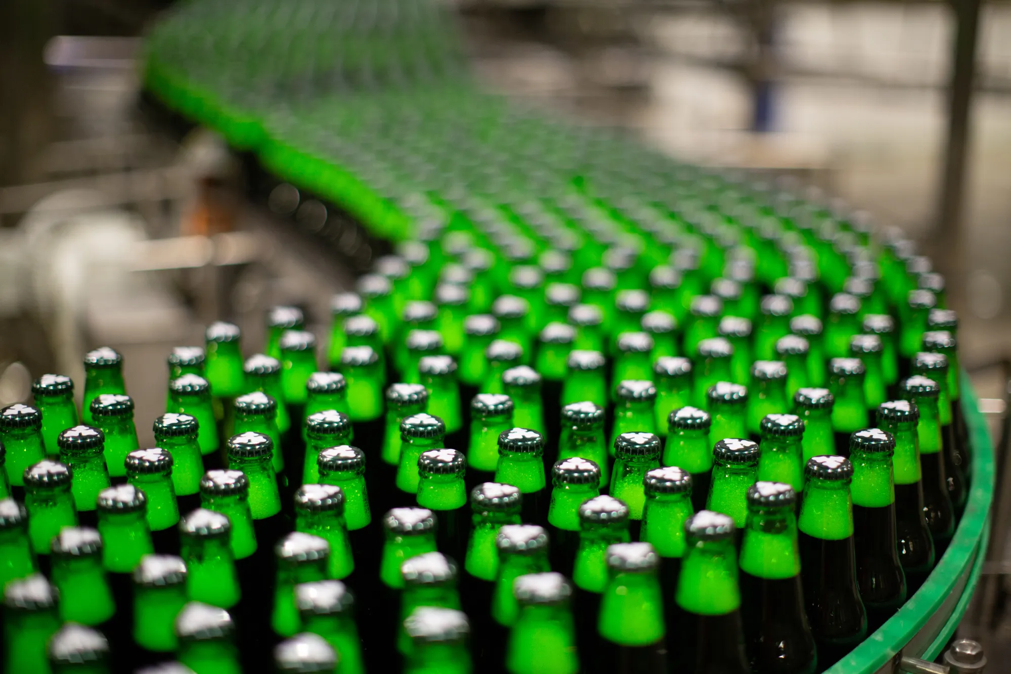 在圣彼得堡的巴尔蒂卡啤酒厂生产线上的嘉士伯啤酒瓶。