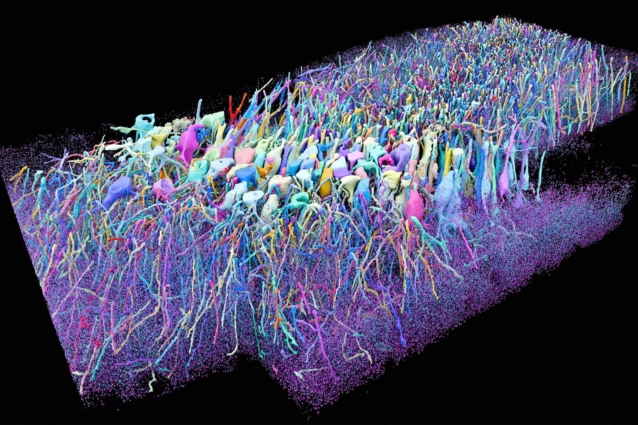 一张展示使用E11 Bio开发的脑映射技术重建小鼠海马体中神经元和突触的图像。在十月初,科学家们揭示了一项壮观的成果——一张果蝇大脑的完整地图。果蝇的大脑大约只有一粒盐的大小,拥有140,000个神经元,通过近500英尺的生物电缆连接。该地图展示了多种类型的细胞及其连接方式。它承诺帮助我们更好地理解大脑是如何工作的。科学家们欢欣鼓舞。