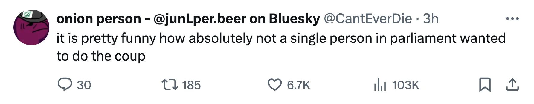 彭博社观点韩国的戒严法让人想起可怕的过去芬太尼限制将使习近平轻松获胜连黑石集团也在逃离公共市场埃隆仍然无法拿到他的资金幸运的是,民主依然生机勃勃:尹锡悦总统对紧急法令的理由——关于反对党充满金正恩同情者的毫无根据的说法——非常可疑,没人接受。进入大厅的190名立法者一致投票反对戒严法。随后,尹解除了该命令。一些人觉得整个事件很有趣,称其为历史上执行最糟糕的政变之一: