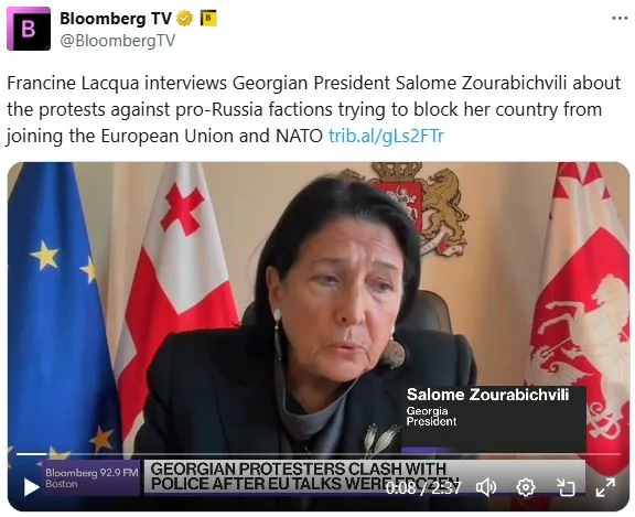 今天,彭博电视台的 权力平衡 上午1点的早间版中,弗朗辛·拉夸与格鲁吉亚总统萨洛梅·祖拉比什维利进行了采访,讨论了她的国家如何与试图阻止其加入欧盟和北约的亲俄派系斗争。