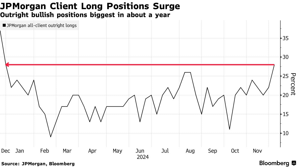 截至12月2日的一周,摩根大通客户将直接多头头寸增加了6个百分点,脱离中立,空头在本周保持不变。所有客户的直接多头头寸跃升至自12月11日以来的最高水平,净多头头寸达到自11月4日以来的最高水平。