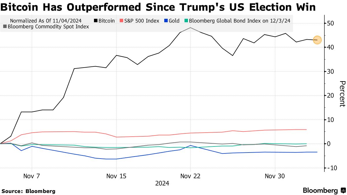 在周三早盘的亚洲交易中,这种最大的数字资产交易价格约为96,000美元,自特朗普11月5日当选以来上涨超过40%。这位共和党人计划撤销拜登政府对数字资产的打压。