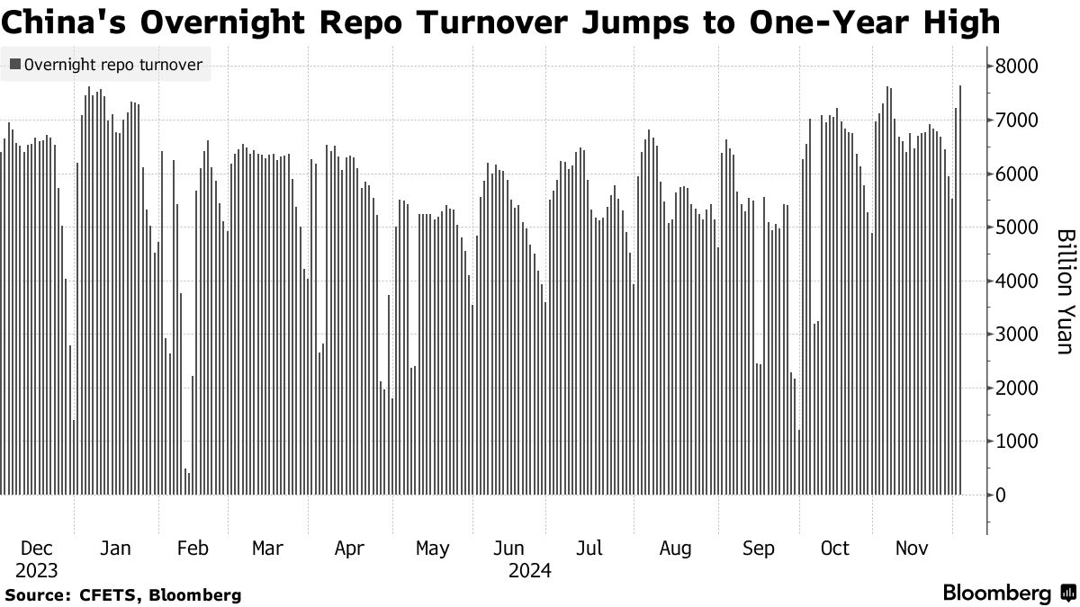 根据彭博社汇编的数据,周三隔夜回购合同的交易量跃升至7.6万亿元人民币(约合1.04万亿美元),为2023年8月以来的最高水平。这表明交易员们越来越多地使用这一流行的借贷工具来兑现地方主权债券的持续反弹。