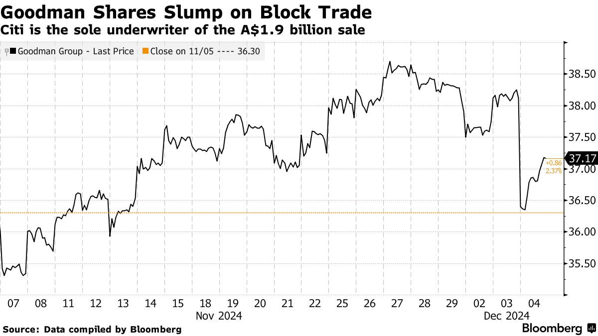 该银行 于周二晚上发起对5040万股古德曼股份的出售,承销底价为37.55澳元。根据交易条款,这比该股前一交易日的收盘价38.12澳元仅有1.5%的折扣。